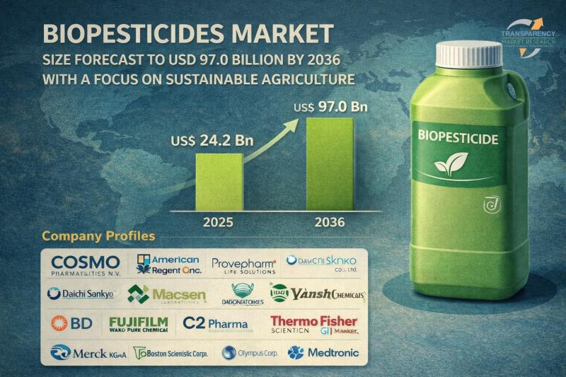 The global biopesticides market was valued at US$ 24.2 Bn in 2025 and is projected to reach US$ 97.0 Bn by 2036, expanding at a robust CAGR of 13.5% from 2026 to 2036. The market growth is primarily driven by the increasing shift toward sustainable agriculture, rising demand for organic food products, and stringent regulations on synthetic chemical pesticides worldwide.