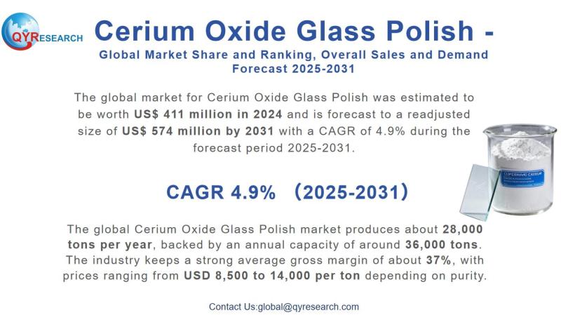 The global market for Cerium Oxide Glass Polish was estimated to be worth US$ 411 million in 2024 and is forecast to a readjusted size of US$ 574 million by 2031 with a CAGR of 4.9% during the forecast period 2025-2031.