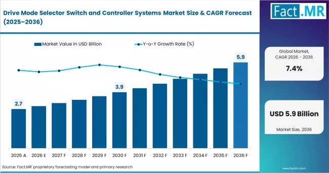 The global Drive Mode Selector Switch and Controller Systems Market is entering a high-growth phase, driven by the rapid evolution of software-defined vehicles and intelligent automotive control systems. Valued at USD 2.5 billion in 2025, the market is projected to reach USD 2.7 billion in 2026 and expand to USD 5.4 billion by 2036, registering a steady CAGR of 7.4% over the forecast period.