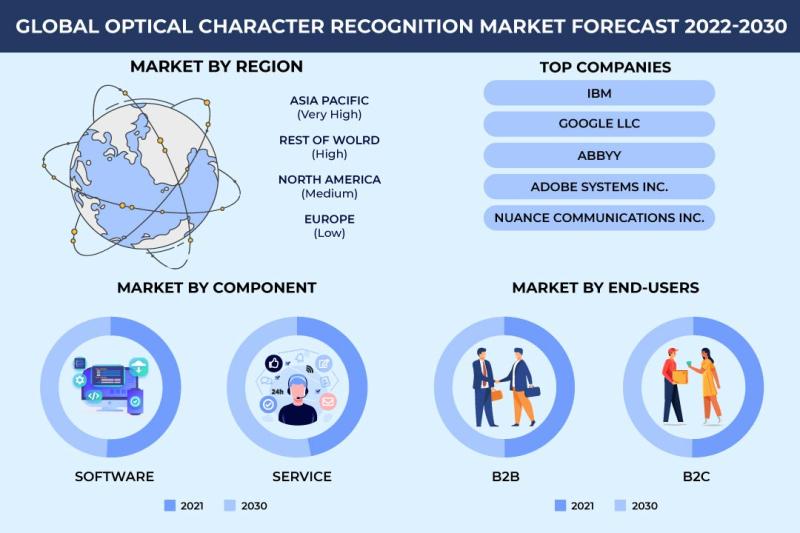According to a new market research report launched by Inkwood Research, the Global Optical Character Recognition Market is anticipated to grow with a CAGR of 15.74% during the forecast period of 2022 to 2030, generating a revenue of $34789.18 by 2030.Browse 51 market data Tables and 45 figures spread over 188 Pages, along with an in-depth analysis of the Global Optical Character Recognition Market by Component, End-User, Industry & by Geography