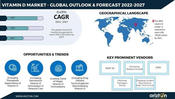 According to Arizton's latest research report, the vitamin D market will grow at a CAGR of 8.5% from 2021-2027. The emerging therapeutic applications of vitamin D, increasing demand for vitamin D formulation in personal care, increasing trend of vegan vitamin D formulations, and emerging drug delivery technologies for administering vitamin D are the growing trends in the global market. Europe is the largest vitamin D market due to the end-user industry concentration. The production and export facilities of pharmaceutical and animal feed industries in countries such as Germany, Italy, Spain, and France paved the way for the growth of the market in Europe. The rise in the prevalence of vitamin deficiencies, growth in disposable income, the aging population, and the diversification of fortified foods drive the APAC market at a CAGR of 9.50%. Apart from major countries such as China, India, Japan, and South Korea, economies such as Australia, Indonesia, and Malaysia are also expected to pose prominent room for expansion.To Know More, Download the Free Sample Report: https://www.arizton.com/request-sample/3607