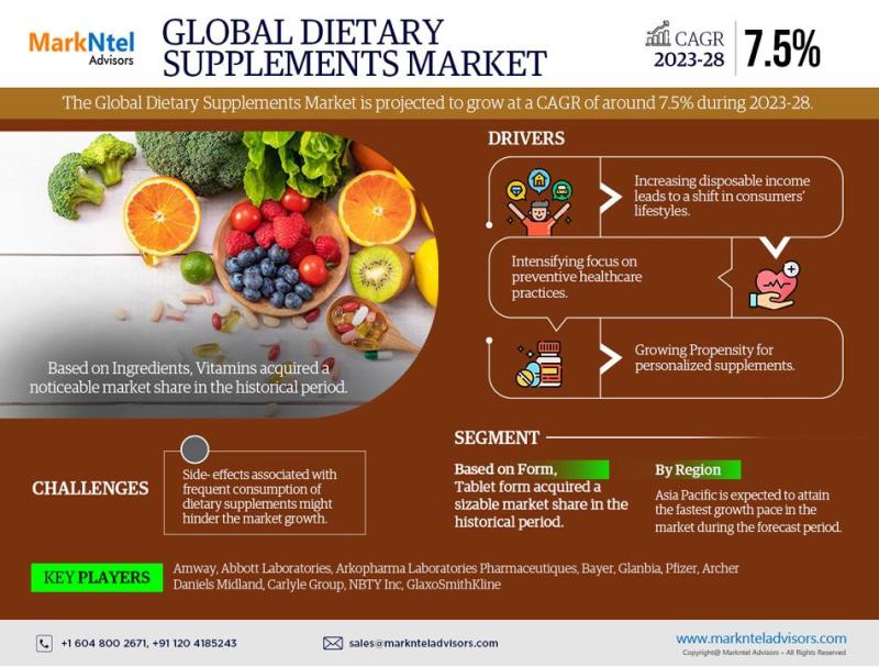 Elucidating the Primary Aspects & Segmentation of the of the Global Dietary Supplements Market (2023-28)MarkNtel Advisors is dedicated to delivering in-depth & comprehensive market research study. The Global Dietary Supplements Market is projected to grow at around 7.5% CAGR during the forecast period, i.e., 2023-28. The report covers various aspects such as strategies, key trends, regional landscape, growth dynamics, lucrative profit opportunities, competitors, and more.