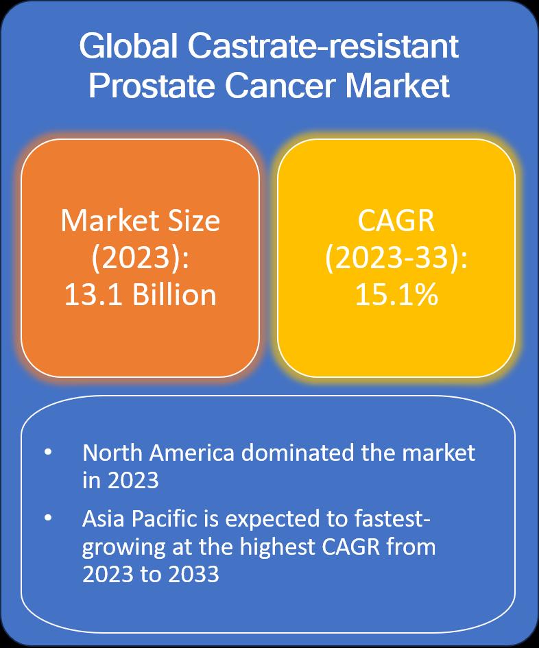 Key Highlights:• The global Castrate-resistant Prostate Cancer Market size was valued at USD 13.1 billion in 2023 growing at a CAGR of 15.1% from 2023 to 2033.