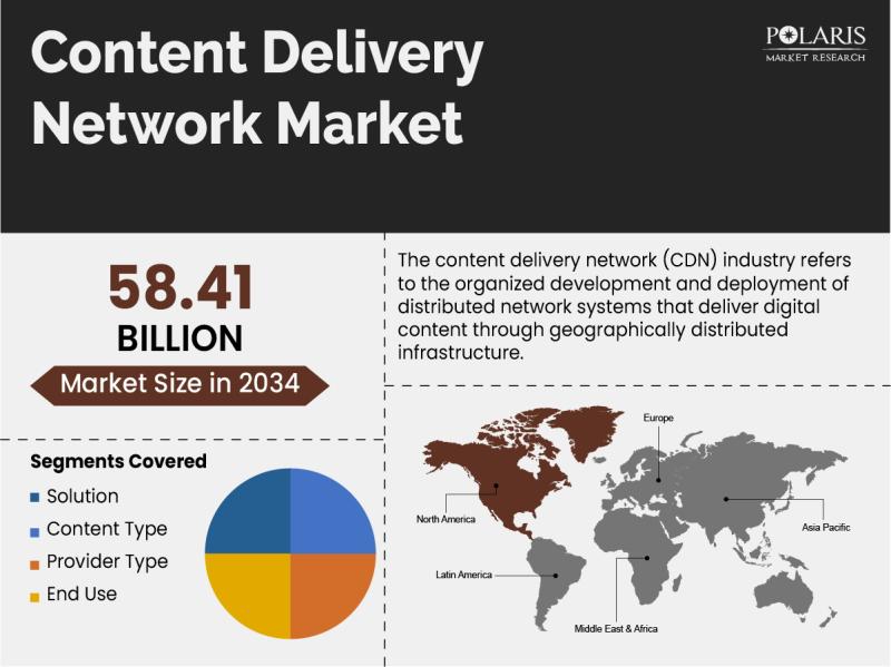 Polaris Market Research recently introduced the latest update on Content Delivery Network Market that provides an extensive outlook of the market, analyzing key growth opportunities, challenges, risk factors, and emerging trends across diverse geographic regions. The report offers a definitive and meticulous analysis of the Content Delivery Network Market size, share, demand, key growth factors, segmentation, country-level overview, and forecast.