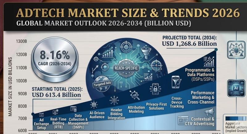 According to a research report by IMARC Group, the global AdTech market size was valued at USD 613.4 Billion in 2025. Looking forward, the market is projected to reach USD 1,268.6 Billion by 2034, exhibiting a growth rate (CAGR) of 8.16% during 2026-2034. North America currently dominates the AdTech market with over 35.6% share in 2025, driven by advanced digital infrastructure, high internet penetration, strong user engagement, and a robust…