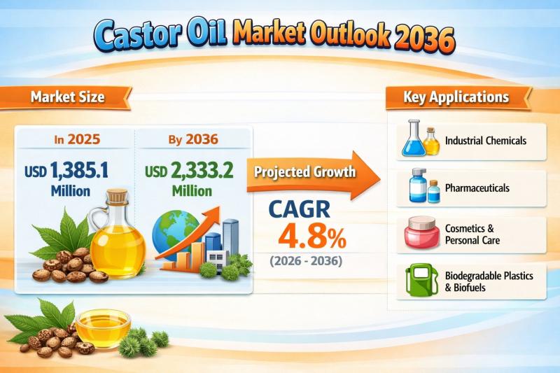 The global castor oil market is witnessing steady and sustained growth, driven by increasing demand for environmentally friendly raw materials and expanding industrial applications. Valued at USD 1,385.1 million in 2025, the market is projected to reach USD 2,333.2 million by 2036, registering a compound annual growth rate (CAGR) of 4.8% during the forecast period from 2026 to 2036.