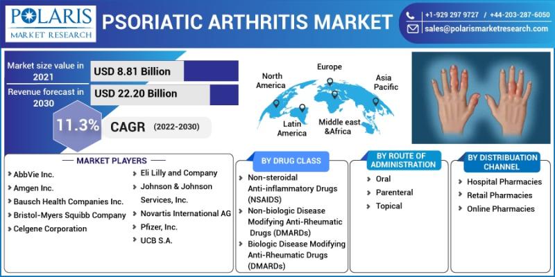 "According to the research report, the global psoriatic arthritis market was valued at USD 8.81 billion in 2021 and is expected to reach USD 22.20 billion by 2030, to grow at a CAGR of 11.3% during the forecast period."Polaris Market Research, a leading global market research and consulting company, has recently published its latest Psoriatic Arthritis Market Industry Size, Growth Potential, and Segmentation Strategies for Leading Manufacturers 2032. The study is an in-depth analysis of the industry, covering all the major aspects industry players and stakeholders need to know. It sheds light on the Psoriatic Arthritis Market size, share, CAGR status, and PESTEL status. Besides, it encompasses other critical elements such as growth prospects, revenue segmentation, industry drivers and constraints, and more.