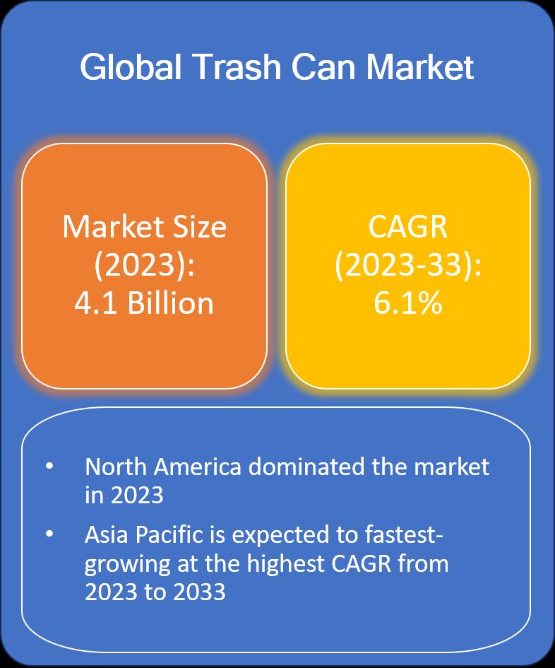 As per the study initiated by Evolve Business Intelligence, the global Trash Can Market size accounted for USD 4.1 Billion in 2023, growing at a CAGR of 6.1% from 2023 to 2033. A "trash can" refers to a container used to hold waste materials, garbage, or trash until it is ready for disposal. Trash cans come in various sizes, shapes, and materials, and they are common household and commercial items designed to help manage and contain waste.Request/Download PDF Sample: https://report.evolvebi.com/index.php/sample/request?referer=OpenPR&reportCode=021947