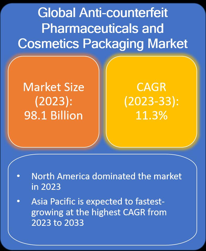 As per the study initiated by Evolve Business Intelligence, the global Anti-counterfeit Pharmaceuticals and Cosmetics Packaging Market size accounted for USD 98.1 Billion in 2023, growing at a CAGR of 11.3% from 2023 to 2033. Anti-counterfeit pharmaceuticals and cosmetics packaging refers to the use of various technologies and measures to prevent the imitation and unauthorized reproduction of pharmaceuticals and cosmetic products. Counterfeit drugs and cosmetics pose significant risks to public health and safety, as they may contain incorrect ingredients, incorrect dosages, or even harmful substances. To address this issue, the industry employs advanced packaging solutions to ensure the authenticity and integrity of products.Request/Download PDF Sample: https://report.evolvebi.com/index.php/sample/request?referer=OpenPR&reportCode=021950