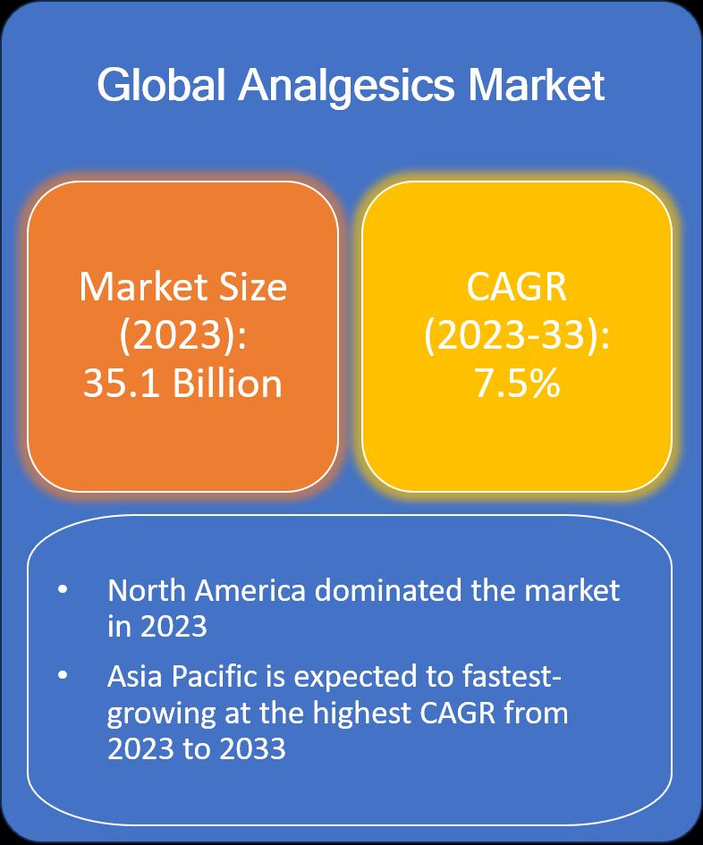 As per the study initiated by Evolve Business Intelligence, the global Analgesics Market size accounted for USD 35.1 Billion in 2023, growing at a CAGR of 7.5% from 2023 to 2033. Analgesics are a class of drugs primarily designed to relieve pain. They work by affecting the body's perception of pain without addressing its underlying cause. Analgesics can be broadly categorized into non-opioid analgesics (such as nonsteroidal anti-inflammatory drugs or NSAIDs) and opioid analgesics (such as morphine and oxycodone).Request/Download PDF Sample: https://report.evolvebi.com/index.php/sample/request?referer=OpenPR&reportCode=021953