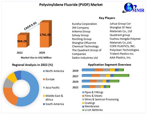 The Polyvinylidene Fluoride (PVDF) Market Size is expected to grow at a CAGR of 9.3% during the forecast period. Polyvinylidene Fluoride (PVDF) Market is expected to reach US$ 1741.03 Mn by 2029.