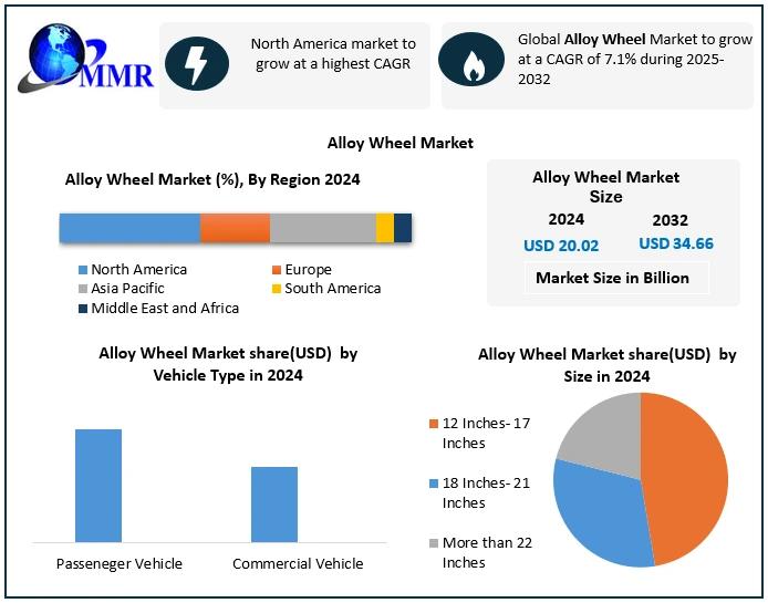 Alloy Wheel Market size was valued at USD 20.02 Bn. in 2024, and the total Alloy Wheel Market revenue is expected to grow by 7.1% from 2025 to 2032, reaching nearly USD 34.66 Bn.
