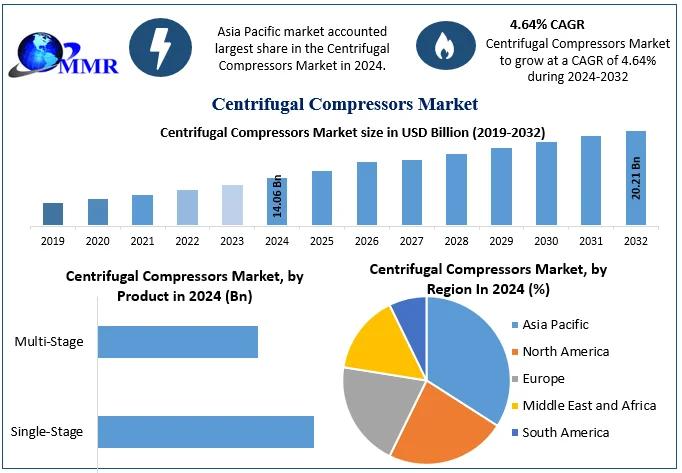 Centrifugal Compressors Market was valued at USD 14.06 Bn in 2024 and is expected to reach USD 20.21 Bn by 2032, at a CAGR of 4.64% during the forecast period.