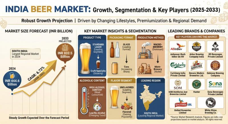 According to IMARC Group's report titled "India Beer Market Size, Share, Trends and Forecast by Product Type, Packaging, Production, Alcohol Content, Flavor, Distribution Channel, and Region, 2025-2033", this report analyzes how beer brands in India are positioned, how market share is distributed, and how competitive pressures and regulatory risks shape strategic outcomes through 2033. It helps decision-makers understand where structural constraints exist, how players differentiate, and what challenges influence investment,โฆ