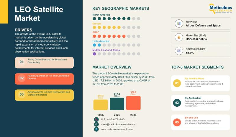 The global Low Earth Orbit (LEO) satellite market is on a trajectory that would have seemed extraordinary just a decade ago. Valued at USD 16.2 billion in 2025, the market is expected to reach USD 17.8 billion in 2026 and climb to approximately USD 58.8 billion by 2036, growing at a rate of 12.7% per year. That's not just growth - it's a fundamental reshaping of how the world communicates,…