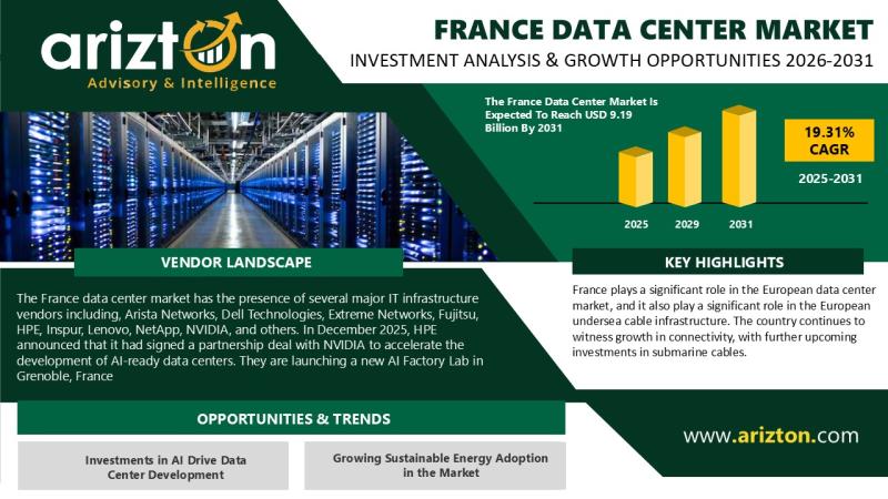 According to Arizton's recent research report, the France data center market is witnessing strong investments from both global and local operators. The market is expected to reach USD 9.19 billion by 2031, growing at a CAGR of 19.31% during the forecast period.