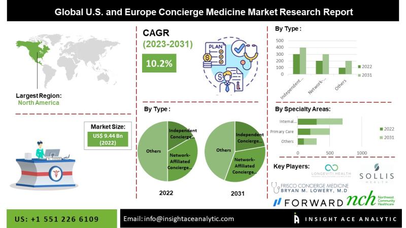 InsightAce Analytic Pvt. Ltd. announces the release of a market assessment report on "The U.S. and Europe Concierge Medicine Market (Type (Independent Concierge Physician, Network-Affiliated Concierge Physician), Specialty Areas (Primary Care, Internal Medicine, Osteopathic Medicine, Cardiology, Pediatric, and Others)) - Technology Trends, Market Analysis, Competition Analysis, Revenue and Forecast Till 2031."According to the latest market intelligence research report by InsightAce Analytic, the The U.S. and Europe Concierge Medicine Market size was valued at US$ 8.13 Billion in 2021, and it is expected to reach US$ 22.47 Billion in 2031, record a promising CAGR of 10.02% from 2024 to 2031.