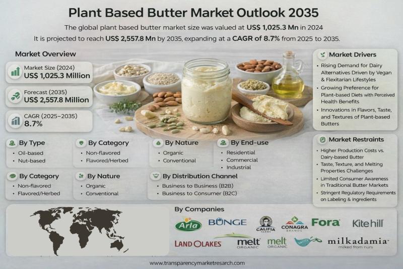 The global Plant Based Butter Market continues to gain momentum as consumers increasingly seek healthier, sustainable, and animal-conscious alternatives to traditional dairy fats. Valued at US$ 1,025.3 Mn in 2024, the market is projected to expand significantly, reaching US$ 2,557.8 Mn by 2035, registering a robust compound annual growth rate (CAGR) of 8.7% from 2025 to 2035.