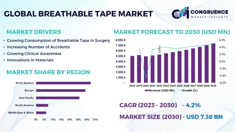 The latest report by Congruence Market Insights, titled 'Global Breathable Tape Market - Size, Trends, Share, Growth, Dynamics, Competition, and Opportunity Forecast, 2023 - 2030,' provides a thorough analysis of the global breathable tape market. The report meticulously examines both macro and micro trends, offering insights into the dynamic factors influencing the market. It encompasses a detailed exploration of qualitative and quantitative aspects, delivering a precise depiction of market size, growth rates, annual progression, prevailing trends, key drivers, promising opportunities, and potential challenges. Additionally, the report highlights the impact of crucial events such as technological advancements and regulatory changes on the breathable tape market landscape. This exhaustive examination equips businesses and stakeholders with invaluable intelligence for making informed decisions in the evolving breathable tape industry.Request full report sample here: https://www.congruencemarketinsights.com/report/breathable-tape-market?section=Request