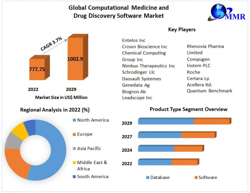 Computational Medicine and Drug Discovery Software Market was valued at US$ 777.75 Mn. in 2022. Global Computational Medicine and Drug Discovery Software Market size is expected to grow at a CAGR of 3.7 % through the forecast period.Computational Medicine and Drug Discovery Software Market Overview