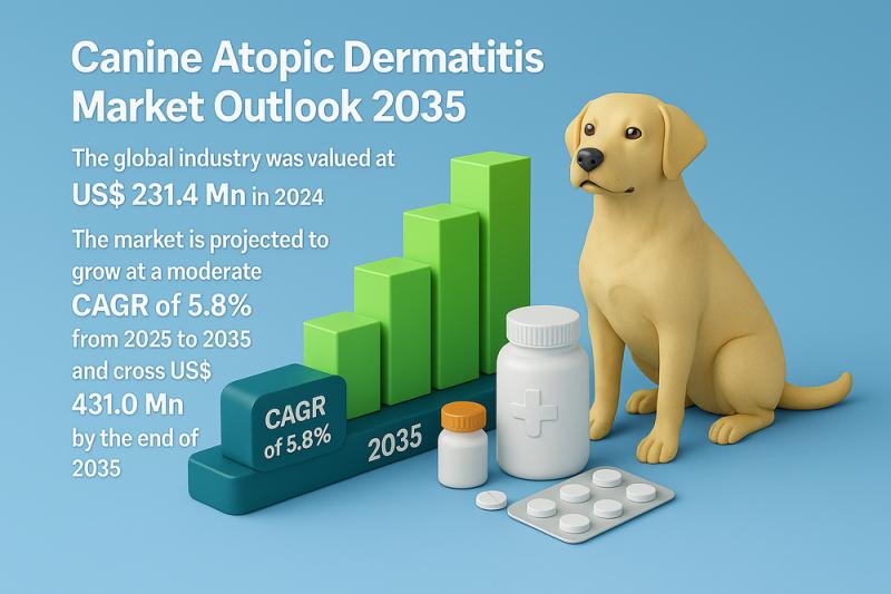 The global Canine Atopic Dermatitis Market is poised for strong long-term expansion, projected to grow at a CAGR of 5.8% from 2025 to 2035, increasing from US$ 231.4 Mn in 2024 to more than US$ 431.0 Mn by 2035. Rising cases of allergic skin disorders in dogs, soaring pet adoption rates, and heightened awareness of pet health are collectively shaping the future trajectory of this dynamic industry.