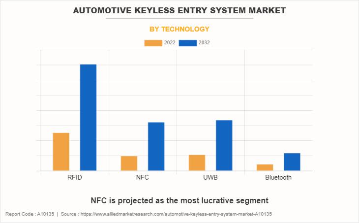 Based on technology, the RFID segment accounted for the largest share in 2022 and is estimated to maintain its leadership status throughout the forecast period. Due to its improved long-range RF communication, car owners can remotely access their vehicles from a greater distance, offering more flexibility and convenience. However, the NFC segment is expected to portray the largest CAGR of 13.0% from 2023 to 2032, due to it provides an extra layer of security as the devices involved in communication need to be in close proximity, reducing the risk of unauthorized access.