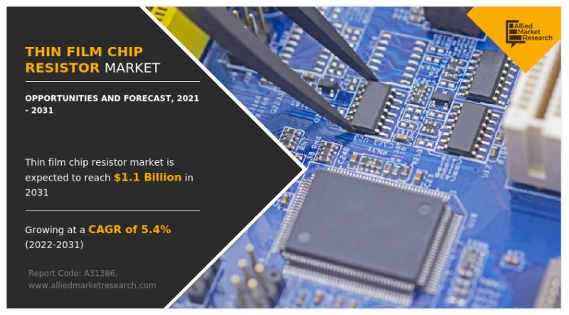 Allied Market Research published an exclusive report, titled, "Thin Film Chip Resistor Market By Type (Ultra Precision 0.05% Tolerance, 0.1% Tolerance, 1% Tolerance, and Others), Application (Instrumentation, Medical Instruments, Power Supply, Electric Power Equipment, Electronic Digital Products, and Others), and End-User (Industrial Equipment, Consumer Electronics, and Others): Global Opportunity Analysis and Industry Forecast, 2021-2031".The global thin film chip resistor market was valued at $631.2 million in 2021, and is projected to reach $1.1 billion by 2031, growing at a CAGR of 5.4% from 2022 to 2031.