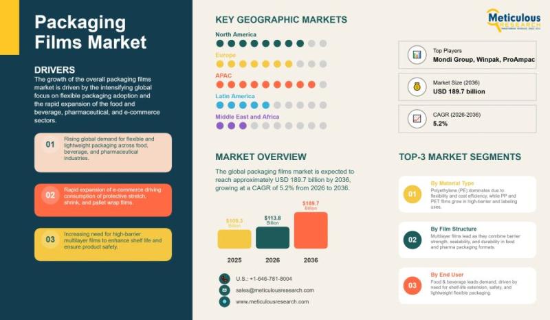 The global packaging films market has been expanding steadily as industries continue to shift toward flexible packaging solutions that provide protection, efficiency, and cost advantages across the supply chain. In 2025, the market was valued at USD 109.3 billion and is projected to grow to approximately USD 113.8 billion in 2026. Over the next decade, the market is expected to experience consistent expansion, reaching nearly USD 189.7 billion by 2036,