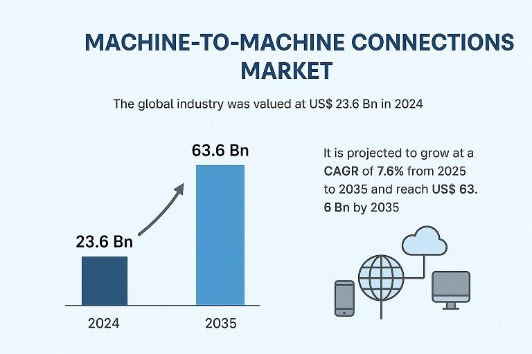 The global Machine-to-Machine (M2M) Connections Market is expanding rapidly as industries and enterprises increasingly rely on seamless device connectivity to improve automation, efficiency, and real-time communication. Valued at US$ 23.6 billion in 2024, the market is projected to reach approximately US$ 63.6 billion by 2035, growing at a CAGR of 7.6% from 2025 to 2035.