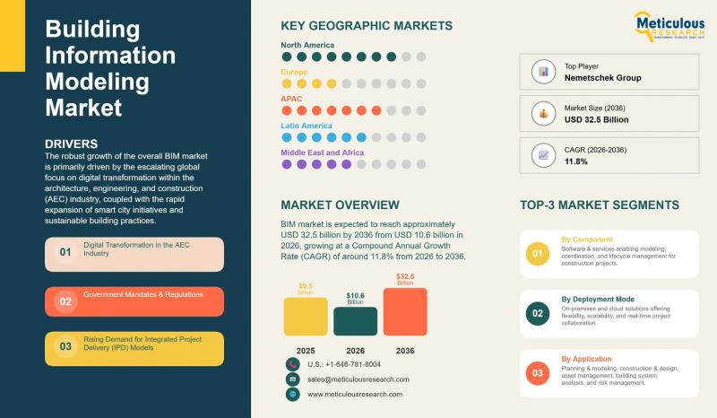 The global Building Information Modeling market was valued at around USD 9.5 billion in 2025 and is expected to reach USD 32.5 billion by 2036, growing from USD 10.6 billion in 2026 at an annual rate of 11.8% over the forecast period. This expansion reflects a broader shift happening across the architecture, engineering, and construction industry as digital tools replace older ways of working. Growing…
