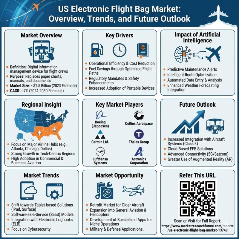 The US Electronic Flight Bag (EFB) Market is entering a phase of continuous expansion driven by the aviation industry's shift toward digital cockpit solutions, rising demand for operational efficiency, and regulatory push to replace traditional paper-based methods with advanced electronic systems. Electronic Flight Bags - digital systems used by flight crews for flight planning, performance calculations, weather information, and more - are rapidly becoming indispensable tools for modern air operations.…