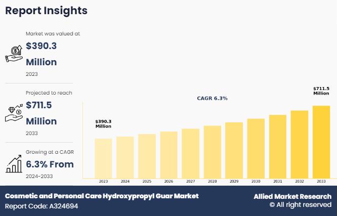 Allied Market Research published a report, titled, "Cosmetic and Personal Care Hydroxypropyl Guar Market by Application (Skin Care, Hair Care, Makeup, Hygiene Products, and Others): Global Opportunity Analysis and Industry Forecast, 2024-2033". According to the report, the cosmetic and personal care hydroxypropyl guar market was valued at $390.3 million in 2023 and is estimated to reach $711.5 million by 2033, growing at a CAGR of 6.3% from 2024 to 2033.…