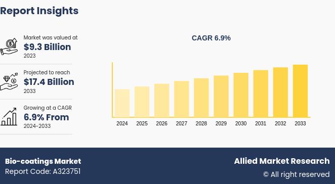 Allied Market Research published a report, titled, "Bio-coatings Market by Resin (Alkyd, Polyurethane, Acrylic, and Others), and Application (Transportation, Construction, Woodworking, Packaging, and Other): Global Opportunity Analysis and Industry Forecast, 2024-2033". The global bio-coatings market was valued at $9.3 billion in 2023 and is estimated to reach $17.4 billion by 2033, exhibiting a CAGR of 6.9% from 2024 to 2033.