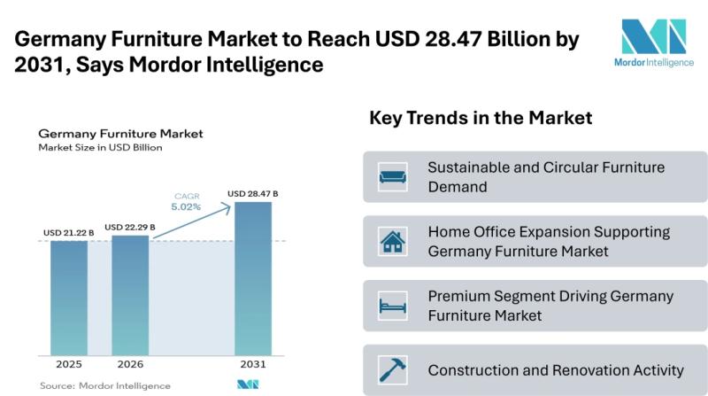 According to Mordor Intelligence, the Germany furniture market size [https://www.mordorintelligence.com/industry-reports/germany-furniture-market?utm_source=abnewswire] in 2026 is estimated at USD 22.29 billion, growing from USD 21.22 billion in 2025 and projected to reach USD 28.47 billion by 2031, registering a CAGR of 5.02% during the forecast period. The market…