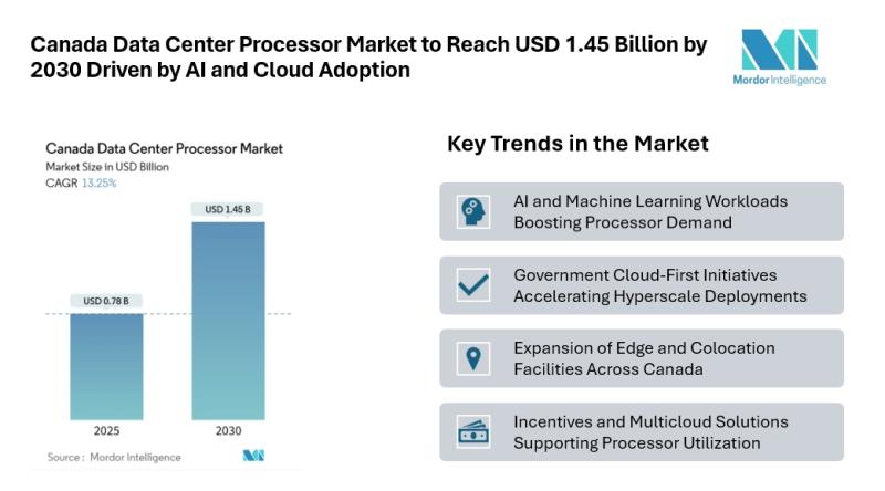 The Canada Data Center Processor Market [https://www.mordorintelligence.com/industry-reports/canada-data-center-processor-market?utm_source=abnewswire] size reached USD 0.78 billion in 2025 and is projected to hit USD 1.45 billion by 2030, advancing at a 13.25% CAGR.