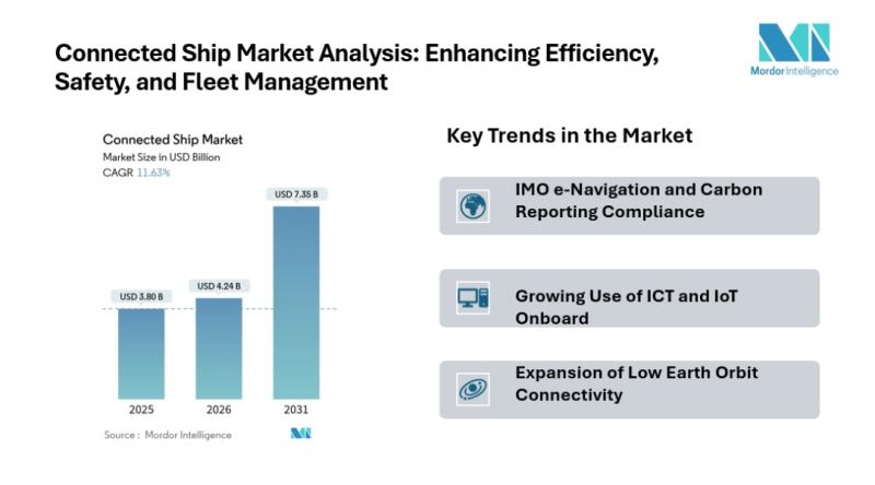 According to Mordor Intelligence, the connected ship market size is estimated at USD 4.24 billion in 2026, growing from USD 3.80 billion in 2025, and is projected to reach USD 7.35 billion by 2031, expanding at a CAGR of 11.63% during the forecast period. This…