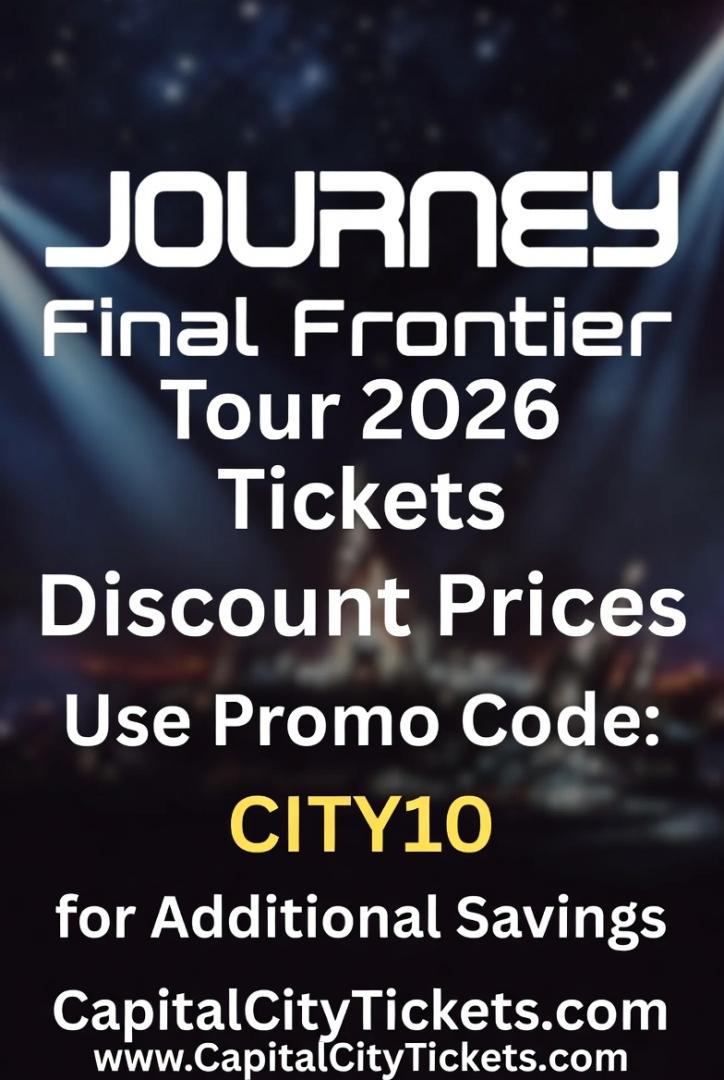 Score your tickets for Journey's Final Frontier Tour 2026 at discounted prices! Don't miss the chance to see this legendary rock band live. Use promo code CITY10 at CapitalCityTickets.com for instant savings and secure the best seats before they sell out. Experience classic hits and unforgettable performances while saving big on your Journey concert tickets. Limited availability - act now to grab your deal!