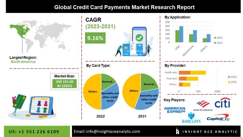 Credit Card Payments Market" in terms of revenue was estimated to be worth $162.58 billion in 2023 and is poised to reach $327.68 billion by 2031"Credit Card Payments Market" in terms of revenue was estimated to be worth $162.58 billion in 2023 and is poised to reach $327.68 billion by 2031, growing at a CAGR of 9.35% from 2023 to 2031 according to a new report by InsightAce Analytic.