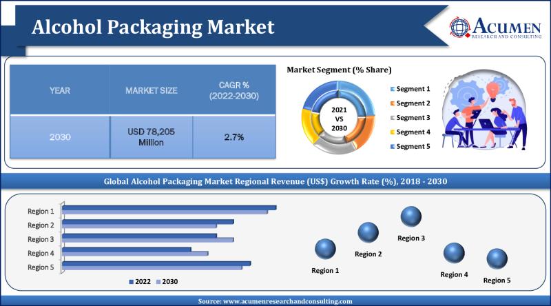 Key Points and Statistics on the Alcohol Packaging Market:● The global alcohol packaging market size is projected to expand to USD 78,205 Million by 2030, growing at a CAGR of 2.7% from 2022 to 2030.