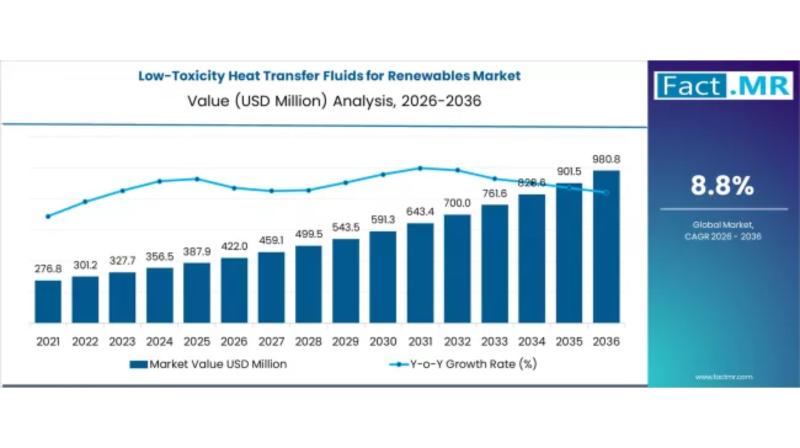 The global low-toxicity heat transfer fluids for renewables market is set for strong and sustained growth, driven by accelerating investments in renewable energy systems and increasing regulatory focus on environmental safety. According to a recent industry analysis, the market is projected to expand from USD 422.00 million in 2026 to USD 980.85 million by 2036, registering a robust CAGR of 8.8% during the forecast period.