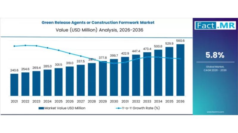 The global green release agents for construction formwork market is set for steady expansion, driven by rising environmental regulations, growing adoption of sustainable construction materials, and increasing awareness of worker safety and eco-friendly building practices. According to a recent market study, the market is projected to grow from USD 319.00 million in 2026 to USD 560.59 million by 2036, registering a CAGR of 5.8% during the forecast period.