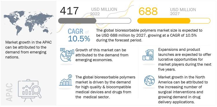 The bioresorbable polymers market [https://www.marketsandmarkets.com/Market-Reports/bioresorbable-polymer-market-235258717.html] size is estimated to be USD 417 million in 2022 and is projected to reach USD 688 million by 2027 at a CAGR of 10.5% during the forecast period. The major drivers in this bioresorbable market are the growing demand for biocompatible medical devices, increasing surgical interventions, growing demand in drug delivery applications, and favorable reimbursement scenarios. The high cost of bioresorbable polymers compared to conventional polymers, lack of quality control in developing countries, and preference for minimally invasive surgeries are the major restraints for bioresorbable polymers. A significant opportunity in the resorbable polymers market is increasing the production of environmentally friendly products to meet the regulatory standards set by various environmental protection agencies. A stringent regulatory framework for medical devices and skilled personnel for the effective use of bioresorbable medical products remains a significant challenge in this market.