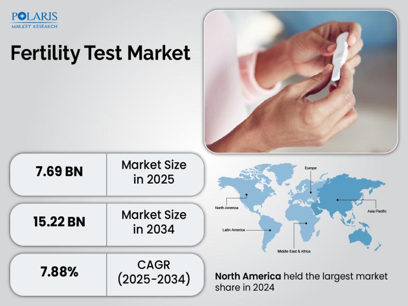 Global Fertility Test Market is currently valued at USD 7.14 Billion in 2024 and is anticipated to generate an estimated revenue of USD 15.22 Billion by 2034, according to the latest study by Polaris Market Research. Besides, the report notes that the market exhibits a robust 7.88% Compound Annual Growth Rate (CAGR) over the forecasted timeframe, 2025 - 2034.