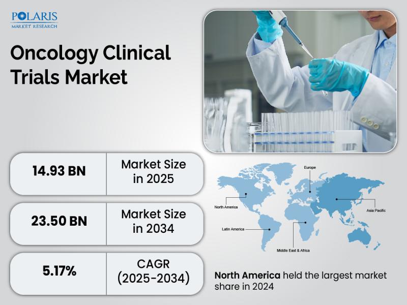Global Oncology Clinical Trials Market is currently valued at USD 14.21 Billion in 2024 and is anticipated to generate an estimated revenue of USD 23.50 Billion by 2034, according to the latest study by Polaris Market Research. Besides, the report notes that the market exhibits a robust 5.17% Compound Annual Growth Rate (CAGR) over the forecasted timeframe, 2025 - 2034