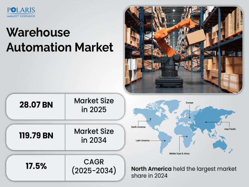 Global Warehouse Automation Market is currently valued at USD 23.97 Billion in 2024 and is anticipated to generate an estimated revenue of USD 119.79 Billion by 2034, according to the latest study by Polaris Market Research. Besides, the report notes that the market exhibits a robust 17.5% Compound Annual Growth Rate (CAGR) over the forecasted timeframe, 2025 - 2034.