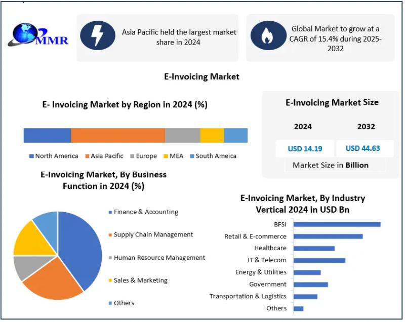 The E-Invoicing Market was valued at USD 14.19 Bn in 2024, and total global E-Invoicing Market revenue is expected to grow at a CAGR of 15.4% and reach nearly USD 44.63 Bn from 2025 to 2032.