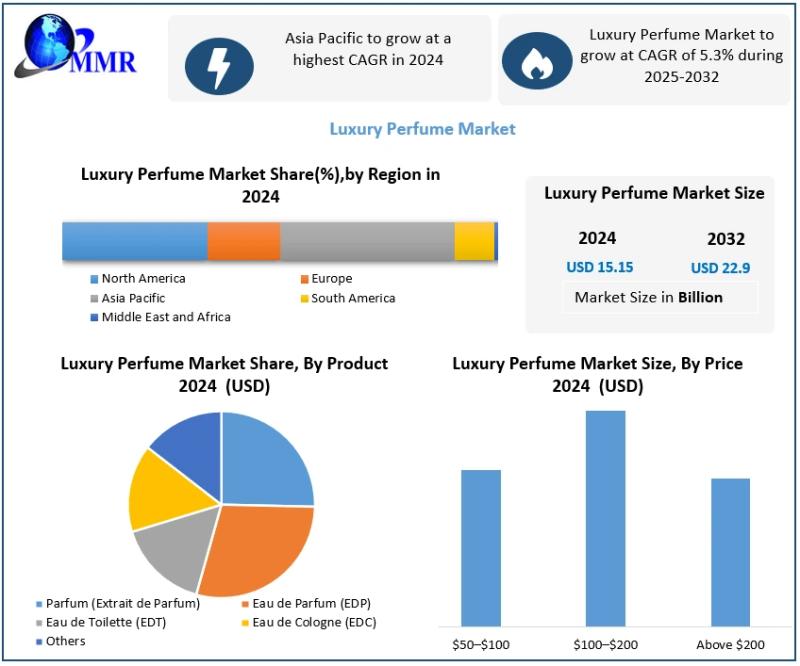 The global Luxury Perfume Market was valued at USD 15.15 billion in 2024 and is projected to grow at a CAGR of 5.3 % to reach approximately USD 22.9 billion by 2032.