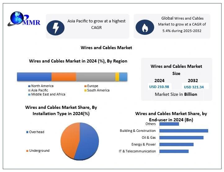 Wires and cables Market size was valued at USD 210.98 Bn. in 2024 and the total Global Wires and cables Market revenue is expected to grow at a CAGR of 5.4% from 2025 to 2032, reaching nearly USD 321.34 Bn. by 2032.