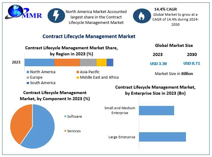 The Global Contract Lifecycle Management Market is witnessing substantial growth driven by the changes in consumer preferences that have a significant impact on the demand for Contract Lifecycle Management. The Contract Lifecycle Management Market is segmented into Component, Enterprise Size, and Application for a better understanding of the market structure.Maximize Market Research, a leading Healthcare business consultancy and research firm has published a report on the [https://www.maximizemarketresearch.com/market-report/global-contract-lifecycle-management-market/74488/] ". The total market opportunity for Contract Lifecycle Management Market was USD 3.39 Bn in 2023 and is expected to grow at a CAGR of 14.4 percent through the forecast period, reaching USD 8.71 Bn by 2030. As per the report, the global Contract Lifecycle Management Market is expected to be dominated by the North American regions at a significant growth rate through the forecast period.
