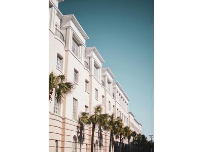 The image features a row of elegant, multi-story residential buildings under a clear blue sky. The buildings are painted in light pastel colors with classic architectural details and framed by tall palm trees, creating a serene and upscale atmosphere. Thi